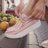 A nossa palmilha é revestida com cortiça verdadeira – um material natural sustentável, que não é apenas agradavelmente leve, mas também respirável e regulador de temperatura. A cortiça adapta-se suavemente ao teu pé e apoia um clima saudável e seco para os pés – mesmo após uso prolongado.